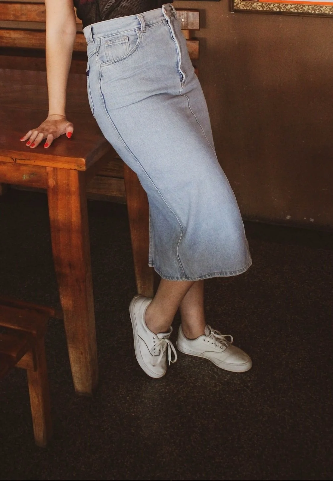 Jewel tones are in fashion with bright orange, royal blue, and fuschia. Eg. Wear a royal blue cashmere sweater over a collared shirt and pair with a midi jean skirt.