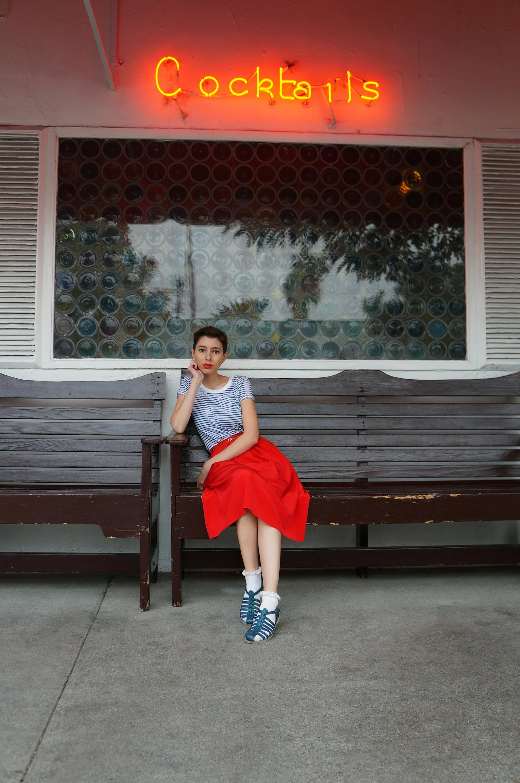 Red statement skirts, socks with ruffles, blue and white striped shirts, and pixie cuts.
